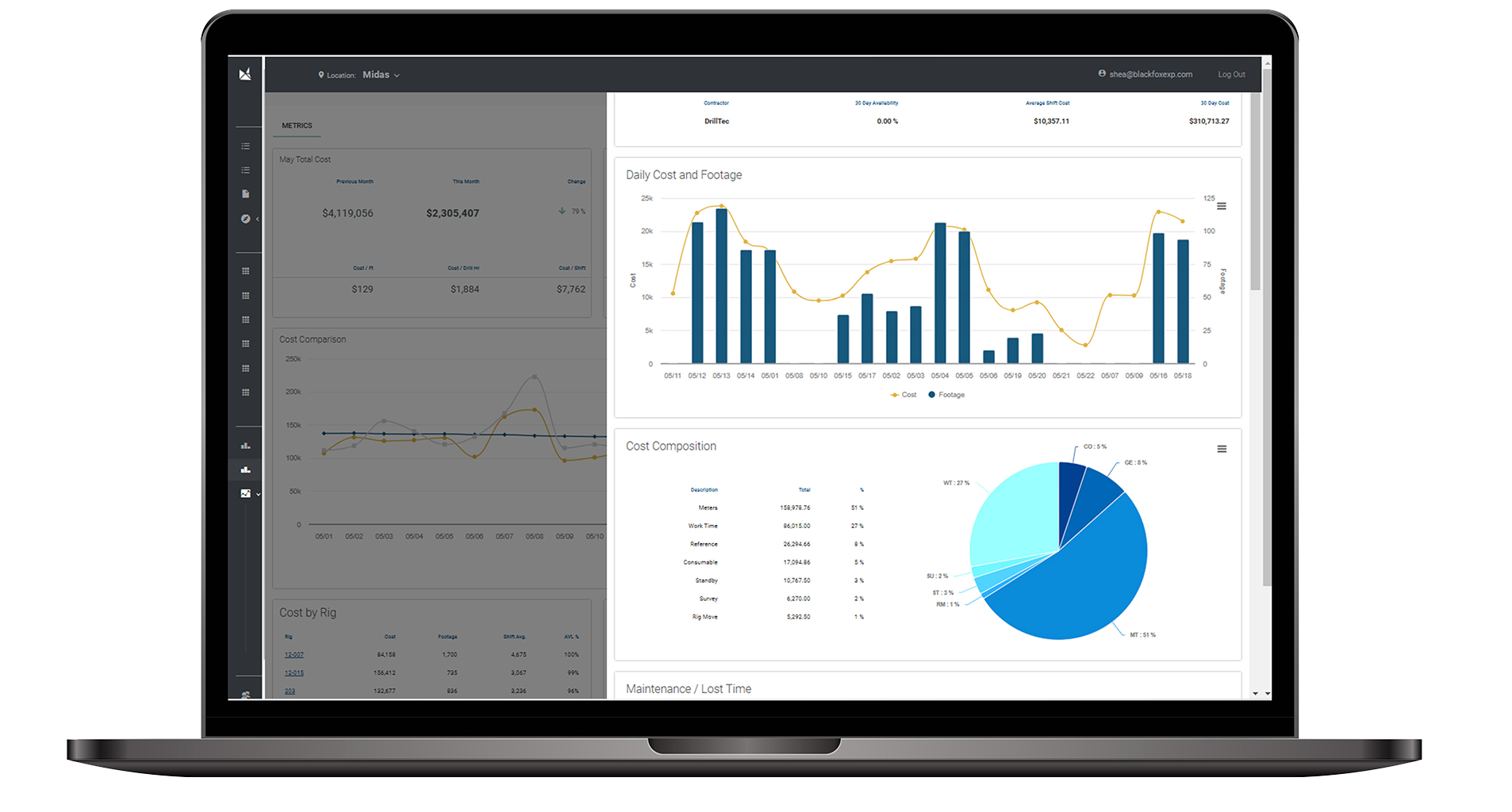 BlackFox puts you in control of your drilling with clear, real-time visibility across every program. Track the metrics that matter, spot trends, compare performance by rig, driller, project or region and uncover where you can optimise your budget and increase efficiency.
