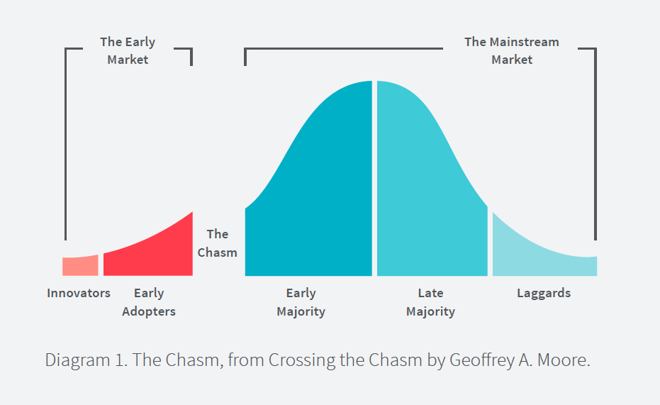 The mining industry is still in the Early Market phase of the technology adoption curve [see diagram 1] and, from a data collection perspective, must cross the chasm from manual, old-school ways to an environment where sensors dominating the data collection landscape are mainstream.